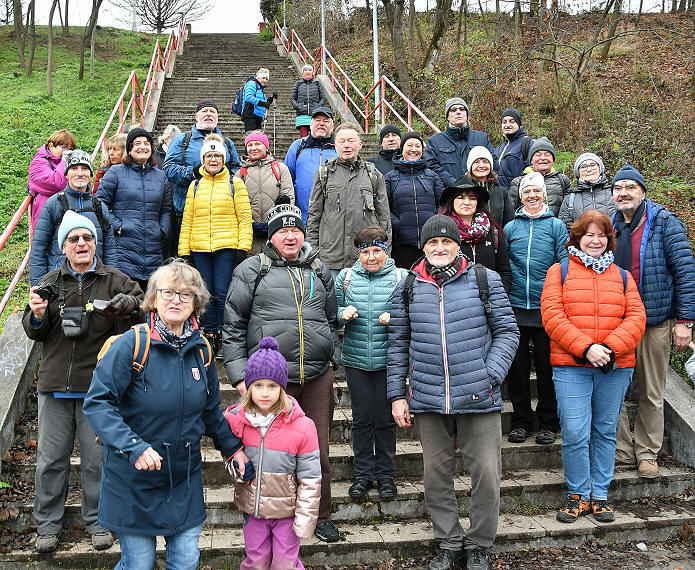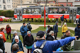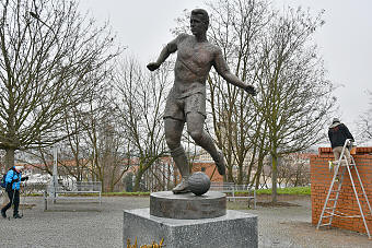 | Vyběhli jsme schody (na zahřátí) a byli jsme na Julisce. Zde Karel zavzpomínal na své návstěvy a také nás nechal zasoutěžit ve fotbalových znalostech. V soutěži vyhrála, jak jinak, největší fotbalová odbornice Alena 8. Prohlédli jsme si pomník Josefa Masopusta z května 2012, v roce 50. výročí mistrovství světa v Chile, kde ve finále dal jediný gól Československa. Pomník lemuje kruhový chodník slávy fotbalistů Dukly s otisky chodidel a jedním otiskem ruky Ivo Viktora. |