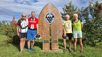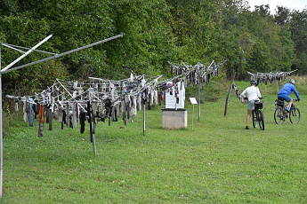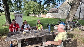 nejsem bohužel šikovná psavka. Ani psavec. V pondělí 15.9. jsme se sešli v poledne, pak vyzvedli Františka na vlakové zastávce Ladná a pokračovali do Břeclavi a Lanžhotu, kde jsme natrefili místní hody. V Moravské Nové Vsi jsme uctili památník vína Cabernet Moravia a také načerpali od vinaře burčák. Na informačních panelech jsme se dozvěděli, že přes Ves vedla Ferdinandova Severní dráha spojující Vídeň a Malopolsko a že zde byl největší parní válcový mlýn v republice. |